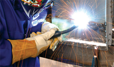 WELDING GLOVES: Heavy duty leather gloves used to prolong the conduction of intense welding heat to the palm of your hand.