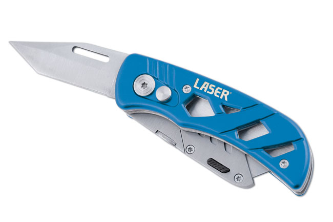 MECHANIC’S KNIFE: Used to open and slice through the contents of cardboard cartons delivered to your front door; works particularly well on contents such as seats, vinyl records, liquids in plastic bottles, collector magazines, refund checks, and rubber or plastic parts. Especially useful for slicing work clothes, but only while in use. It is also useful for removing large chunks of human flesh from the user’s hands.