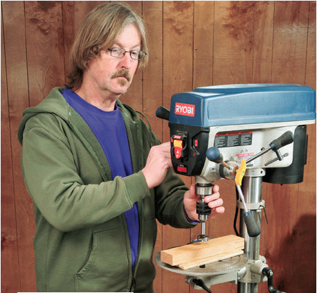 DRILL PRESS: A tall upright machine useful for suddenly snatching flat metal bar stock out of your hands so that it smacks you in the chest and flings your beer across the room, splattering it against that freshly-stained heirloom piece you were drying.